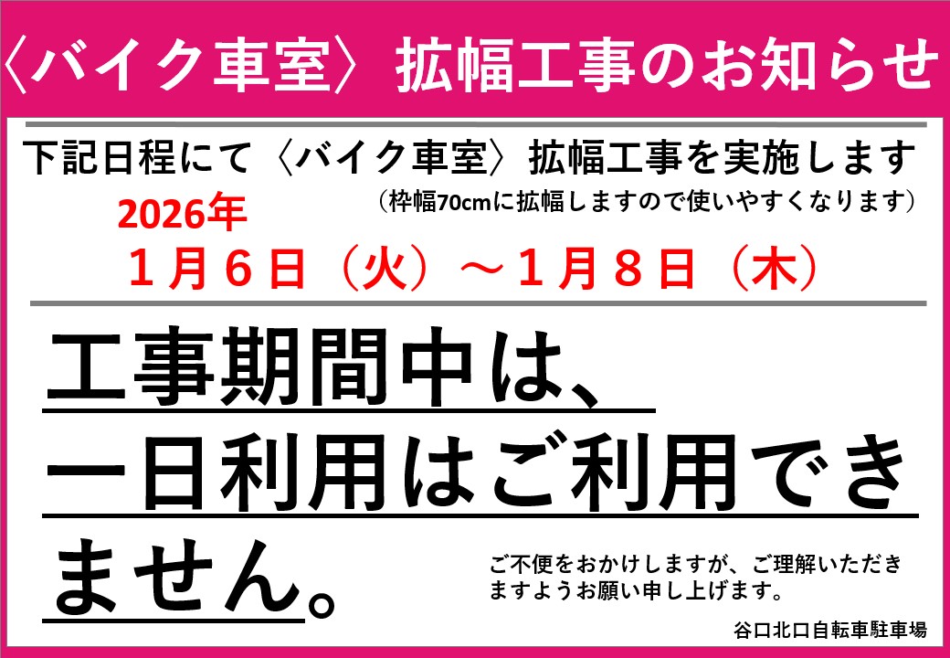 2026年1月6日(火)~1月8日(木)の日程で、バイク車室拡幅工事が実施されます。