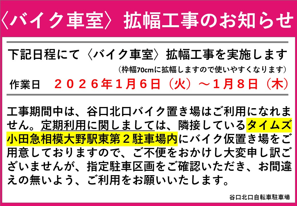 【谷口北口自転車駐車場】〈バイク車室〉拡幅工事のお知らせ